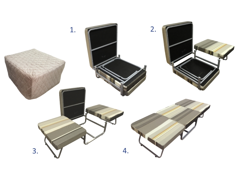 Оригинальная модель пуфа, которая трансформируется в кровать, станет незаменимым предметом интерьера. Благодаря пуфу-трансформеру можно организовать как дополнительное сидячее место, так и спальное.