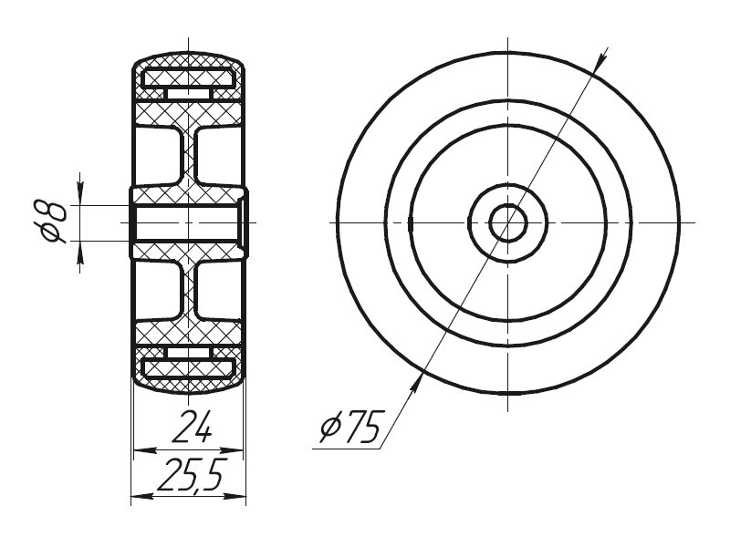 Размеры колеса - 75х25,5 мм